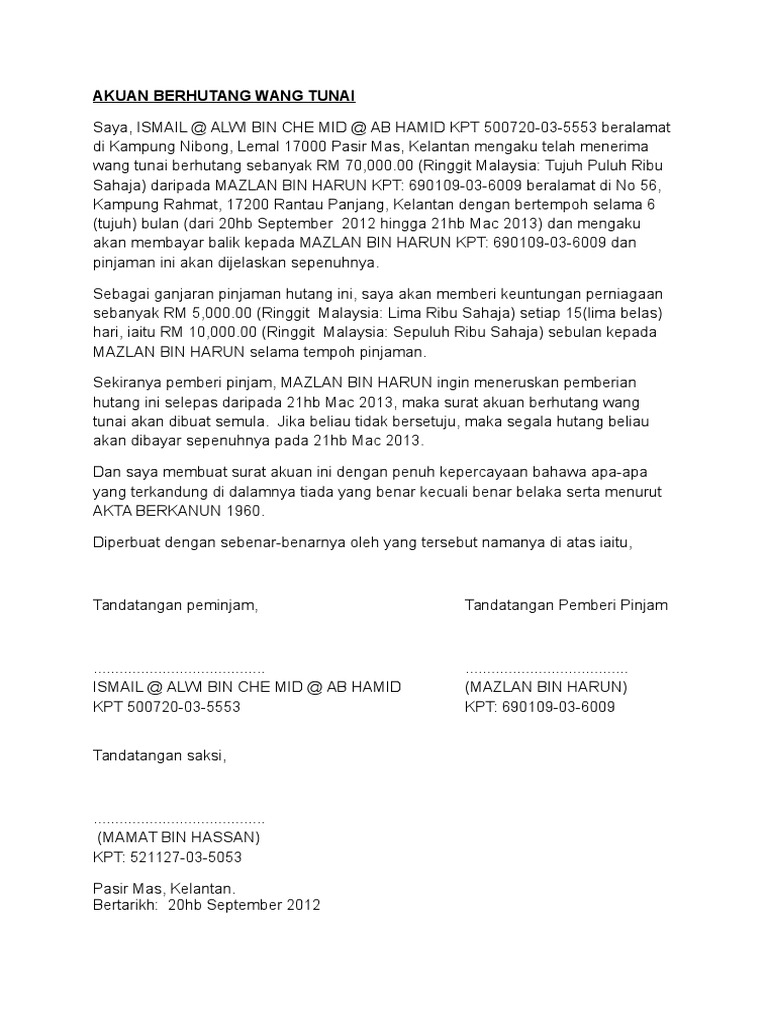Http Www Agc Gov Bn Agc 20images Laws Peng Pdf Penggal 2089 20 20akta 20syarikat 20kewangan Pdf from Contoh surat rasmi pembatalan visa. Salinan template surat akuan adalah di dalam link di bawah. Contoh surat perjanjian pinjaman wang contoh surat akuan meminjam wang download kumpulan gambar artinya jika salah satu pihak bermasalah maka akan : Text of surat akuan penerimaan wang/bayaran. Dimana surat tersebut menjadi penjelas siapa yang meminjam, jumlah yang dipinjam, orang yang meminjami, batas pengembalian bagi anda yang akan melakukan kegiatan peminjaman uang atau pun orang yang meminjami uang, tentunya harus mengerti akan. Pihak pertama telah menerima uang sebesar rp30.000.000,00 (tiga puluh juta rupiah) dari pihak kedua dengan catatan bahwa uang tersebut. Biasanya perjanjian ini akan dibuat secara tertulis agar ada bukti otentik, dan umumnya akan disebut dengan surat. Merinci segala hal tentang surat perjanjian pinjam uang, hutang piutang, pengertian memahami secara rinci seputar surat perjanjian hutang piutang atau biasa dikenal juga di sini, kita akan mengulas secara lengkap mulai dari pengertian, contoh, hingga cara.